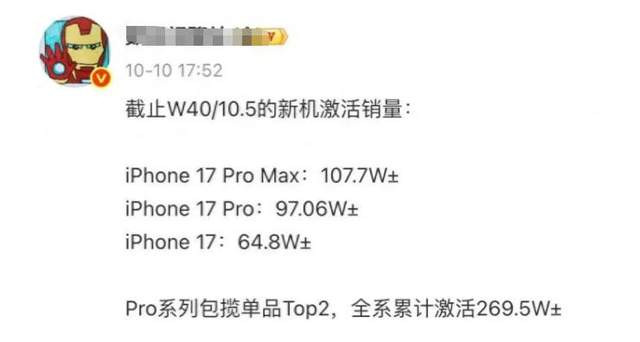 数据显示,截止至今年第四十周(10 月 5 日),苹果17系列开售 16 天国内累计激活 269.5W 左右,时间是小米17开售的2倍,但销量则是2.7倍左右。