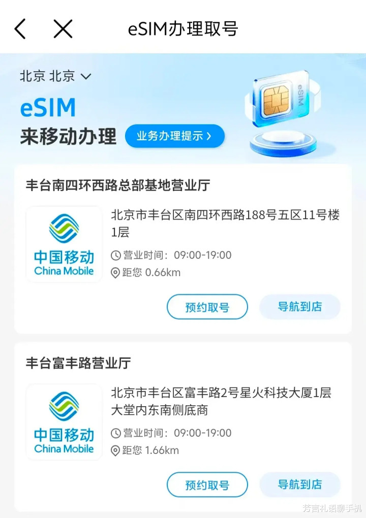用户可以打开中国移动APP,搜索“eSIM”,就能查到支持办理的营业厅,并可在线预约取号。